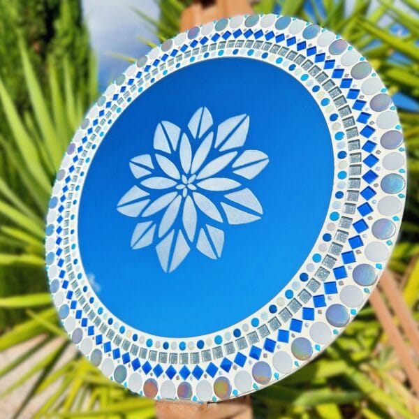 This stylish mirror with its cool blues and whites combined with silver glittery tiles make this mirror beautiful but add to that the striking etched centre then you have a mirror that is perfect.