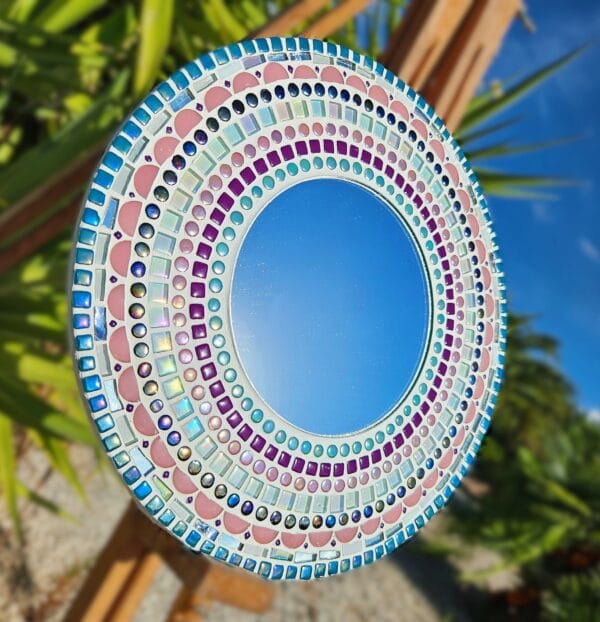 Inspired by the brightest star in the sky, this mosaic wall hanging shines with icy blues and whites with iridescent and pearlescent tones. Catching the light beautifully it’s impossible to miss. with its mirrored background and dotted mandala in the centre.